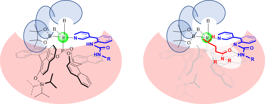 The active catalyst is a iridium complex consisting of a bulky chiral phosphite ligand, three Bpin moieties (Bpin = pinacolboryl) and pyridine-urea ligand creating an enzyme-like cavity. The pyridine-urea acts a supramolecular docking station to bind the substrate carbonyl group and effectively positions the substrate toward the iridium reactive site. Multiple non-covalent interactions between the catalyst ligands (p-p interactions between phosphite napthyl and pyridine-urea ligands), and the incoming substrate and ligands (hydrogen bonds between C-H of the substrate and the O of the phosphite and O of the Bpin groups) allows for a selective pre-organization of the substrate in such way that only one of the C-H bonds at the g-position is activated leading to the R-isomeric product. An extensive substrate scope is covered of aliphatic carboxylic acids (such as (alkyl, aryl) amines and various ester) that constitute one of the most fundamental and widespread compound classes in nature and serve as major feedstock chemicals. The importance of this breakthrough is highlighted producing the pharmacologically interesting (R)-g-alkyl-g-aminobutyric acid (GABA) derivative in just two chemical steps.
