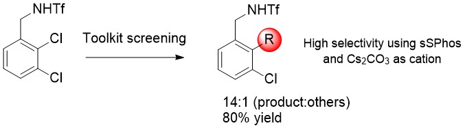 During initial studies, the authors evaluated the chemoselectivity observed in the Suzuki-Miyaura reactions of di-chloroarenes using 0.5 equivalent of boronic acid and a toolkit of two sulfonated ligands and carbonate bases. For the four tested dichlorinated isomer substrates, a high selectivity in favor of the activation of the proximal chloride (2-position) was observed using sSPhos (a 3’-sulfonated Sphos ligand) and a base with a large cation (Rb2CO3 or Cs2CO3) for the 2,3- and 2,5 substrates. For the 2,4-dichlorinated substrate, sXphos (a 4’-sulphonated Xphos ligand) performed with higher selectivity. For all tested substrates, control experiments using Sphos or Xphos as ligand showed no selectivity, confirming that there is no particular bias under the applied reactions conditions toward one specific isomer.
