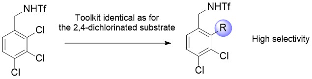 Interestingly, a sequential synthetic method was explored by performing consecutive selective couplings starting from a trichlorinated substrate. By means of two successive site-selective coupling reactions and a standard Suzuki coupling method, the trichlorinated substrate could be converted into a single regioisomer bearing three different arene substituents (see scheme below). The same sequential coupling method was applied to a 2,3,4,5-tetrachlorinated isomer resulting in a successful selective disubstitution on the ortho-and meta-position. However, in this case the Cl3- and Cl4 positions could not react further, probably due to geometrical and steric reasons, showing the limitations of the method. Finally, the authors explore the possibility to introduce the directing sulfonate group directly in the substrate itself, which results also in high selectivity.