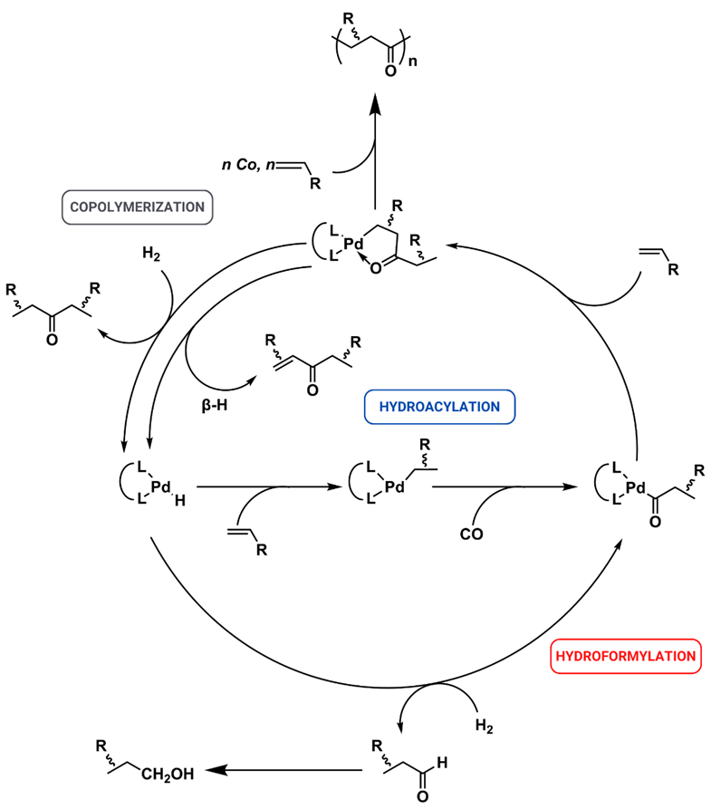 Palladium is often called the chameleon of catalysis due to its versatile chemistry. Although commonly not taken in the list of metals that have been successfully applied in hydroformylation (Rh, Co, Ru), palladium has been investigated for this reaction. Particularly, the work of Eite Drent in the 80’s and 90’s of last millennium has shown that chemistry can be nicely tuned with high precision between hydroformylation (RC(O)H)), hydroacylation (RC(O)R), and polyketone (RC(O)R[C(O)R]n) formation of which one of the authors of this blog was involved. The details of these reactions mostly emerged in patent literature. Key to stirring the chemoselectivity is the judicious choice of electron-rich phosphorus ligands and anion. The bidentate ligands of most interest are still not commonly found in catalysis literature showing that this technology has not been taken up by the academic field.