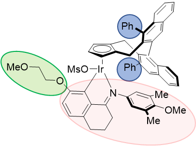 During initial studies, the authors identified an achiral cyclometalated Cp*- iridium [Cp*Ir(C,N)] complex as a very active catalyst for the hydrogenation of an oxime substrate when used in addition to in the presence of a stoichiometric amount of strong Brønsted acid. Furthermore, analysis of the reaction mixture revealed that the formed alkoxy hydroxylamine is completely inactive toward the overreduction and thus no amine product was detected. After these initial findings, the authors elegantly show the different development steps which starts with the introduction of the chiral Cp-ligand to obtain the first chiral catalysis, after which the optimization of the catalyst is performed by alternating rounds of modifications of the Chiral Cp-ligand and the C,N-ligand. Interestingly, the attachment of a methoxyethyl ether improved both the catalyst stability (most probably by temporal ether coordination to the metal center) and the selectivity (by formation of supramolecular H-bond interactions with the protonated oxime substrate). The best catalyst (shown in the figure below) yields full conversion and a high enantiomeric ratio of 96:4 for the oxime model substrate.