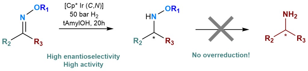 In this context, the production of chiral hydroxylamine derivatives still lacks of a selective method of synthesis. In particular, the hydrogenation of oximes into hydroxylamines is a problematic transformation as the latter is directly reduced to the corresponding amine. In this light, a recent article published in Science by the collaboration between Ecole Polytechnique Fédérale de Lausanne and Syngentha AG (DOI: 10.1126/science.abb2559) reports the use of an iridium-based catalyst for the challenging asymmetric hydrogenation of oxime substrates into chiral hydroxylamine with very high enantioselectivity and very high chemoselectivity (see figure below). To the great surprise of the authors, the reaction takes place without formation of the undesired (over-reduced) amine product. The newly developed iridium catalyst is air and moisture-stable and was successfully used in the synthesis of large variety of chiral hydroxylamine products with commercially interesting high turnover numbers (up to 4000) and selectivities (98:2 e.r.).