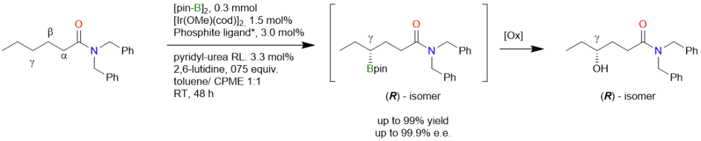 The active catalyst is a iridium complex consisting of a bulky chiral phosphite ligand, three Bpin moieties (Bpin = pinacolboryl) and pyridine-urea ligand creating an enzyme-like cavity. The pyridine-urea acts a supramolecular docking station to bind the substrate carbonyl group and effectively positions the substrate toward the iridium reactive site. Multiple non-covalent interactions between the catalyst ligands (p-p interactions between phosphite napthyl and pyridine-urea ligands), and the incoming substrate and ligands (hydrogen bonds between C-H of the substrate and the O of the phosphite and O of the Bpin groups) allows for a selective pre-organization of the substrate in such way that only one of the C-H bonds at the g-position is activated leading to the R-isomeric product. An extensive substrate scope is covered of aliphatic carboxylic acids (such as (alkyl, aryl) amines and various ester) that constitute one of the most fundamental and widespread compound classes in nature and serve as major feedstock chemicals. The importance of this breakthrough is highlighted producing the pharmacologically interesting (R)-g-alkyl-g-aminobutyric acid (GABA) derivative in just two chemical steps.