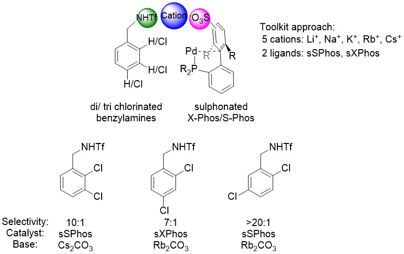 Despite remarkable advances, some of the most commonly used coupling reactions still suffer from a lack of selective methods in this area. In the past decade, various chemoselective strategies were developed based on the use of non-covalent interactions. In these strategies, non-covalent supramolecular interactions between the substrate and the catalyst are introduced to stir the selectively of the reaction by influencing one or more determining steps in the reaction mechanism. In a recent article published in JACS, Phipps and coworkers (DOI: 10.1021/jacs.0c11056) report a new site-selective method for cross coupling reactions using a catalytic toolkit made of two ligands (sulfonated SPhos and XPhos) and a series of bases with different cations of increasing size (Li, Na, K, Rb, Cs). The method was successfully applied to the Suzuki-Miyaura coupling and the Buchwald-Hartwig reaction, providing a direct and highly selective method for the synthesis of multi-substituted arene molecules.