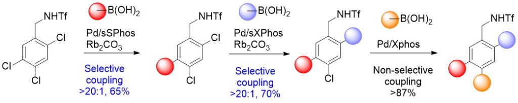 Interestingly, a sequential synthetic method was explored by performing consecutive selective couplings starting from a trichlorinated substrate. By means of two successive site-selective coupling reactions and a standard Suzuki coupling method, the trichlorinated substrate could be converted into a single regioisomer bearing three different arene substituents (see scheme below). The same sequential coupling method was applied to a 2,3,4,5-tetrachlorinated isomer resulting in a successful selective disubstitution on the ortho-and meta-position. However, in this case the Cl3- and Cl4 positions could not react further, probably due to geometrical and steric reasons, showing the limitations of the method. Finally, the authors explore the possibility to introduce the directing sulfonate group directly in the substrate itself, which results also in high selectivity.