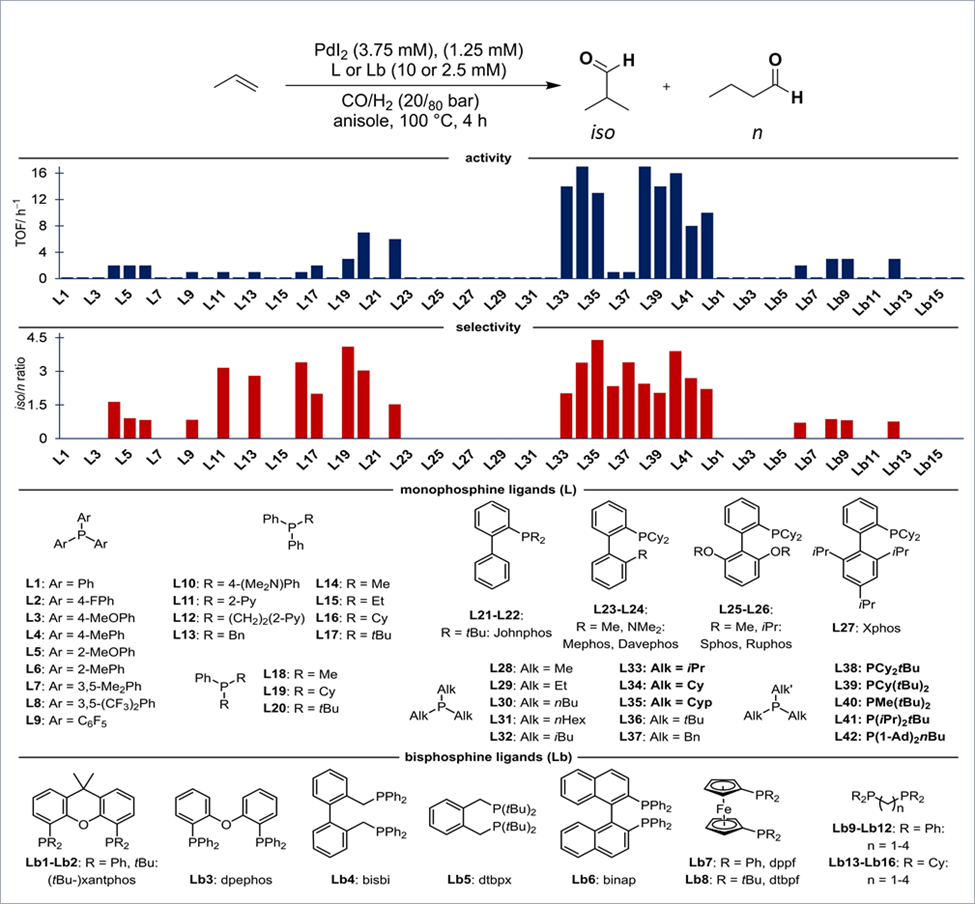 In the new contribution, Dydio and coworkers have developed a palladium-based catalyst employing simple monodentate ligands, making the technology available for large-scale use. One crucial finding is that the authors discovered that iodide can act as an active ligand, working with phosphines to form the aldehyde products. They selected the industrially relevant propene as substrate which is also the most challenging substrate for obtaining isoselectivity. To this end, they screened an extensive and diverse ligand library and correlated descriptive Tolman and cone angle parameters to the activity (TOF) and selectivity (iso/n ratio) of the catalyst. The chemical space was explored using phosphine ligands, various reaction temperatures, PdX2 precursors, amounts of I2 or iodide, ligand/Pd ratios, and CO/H2 ratios and led to a catalytic system with iso/n selectivity ranging from 2:1 to 50:1 (120-80 °C). The use of PdI2, tricyclohexylphoshine, and anisole as the solvent make this process industry-friendly that can be potentially applied in commercial scale.