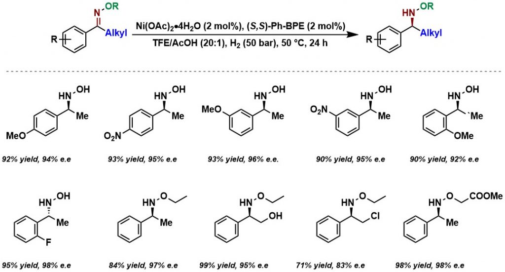 The article by Wanbin Zhang et al. in Nature Chemistry (doi.org/10.1038/s41557-022-00971-8) opens new possibilities as it describes the use of a readily available bisphosphine nickel complex as catalyst for the asymmetric hydrogenation of both substituted and unsubstituted oximes, yielding the formation of optically pure hydroxylamines with yields up to 99% and 99% e.e. Interestingly, it is suggested by the authors that the selectivity of this reaction to the desired hydroxylamine is controlled by supramolecular interactions between the catalyst and oximes particularly the C-H/π∙∙H-C/π interactions between the ligand and the substrate. By performing computational studies the authors showed that these weak interactions significantly contribute to improving the reaction efficiency in terms of the observed enantioselectivity. In addition, the authors addressed the use of TFE being an undesirable solvent for industrial applications in terms of cost and toxicity, and screened the use of alternative solvents. The use of methanol for the transformation of a model substrate led to the formation of the corresponding product in a good yield of 80 % and excellent enantioselectivity of 94 %.