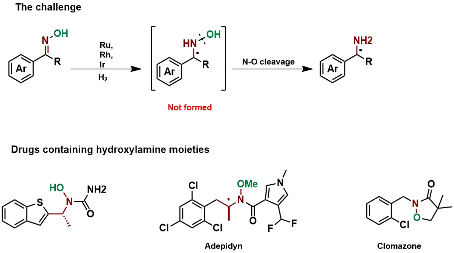 The pool of chiral molecules is of great value across the chemical and pharmaceutical industry as it presents a starting point for the preparation of chiral compounds. A missing member for the generation of chiral centers is the direct asymmetric synthesis of hydroxylamines, a functional group often found in numerous pharmaceuticals. Typically, an organometallic complex bearing a chiral ligand is involved where the chiral information is selectively transferred to produce one of the desired enantiomers. The success of this methodology is well established for the hydrogenation of alkenes (C=C), carbonyls (C=O), and imines (C=N) bonds, increasing the availability of chiral compounds, which are found at key positions in API synthesis.
